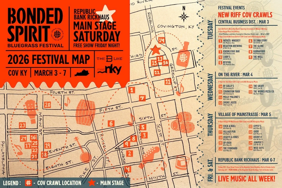 5:00-7:00pm — The "Happy Hour & History" guided stroll down Madison Avenue delivers the real story about Covington's bourbon roots and why "Bottled in Bond" actually matters.